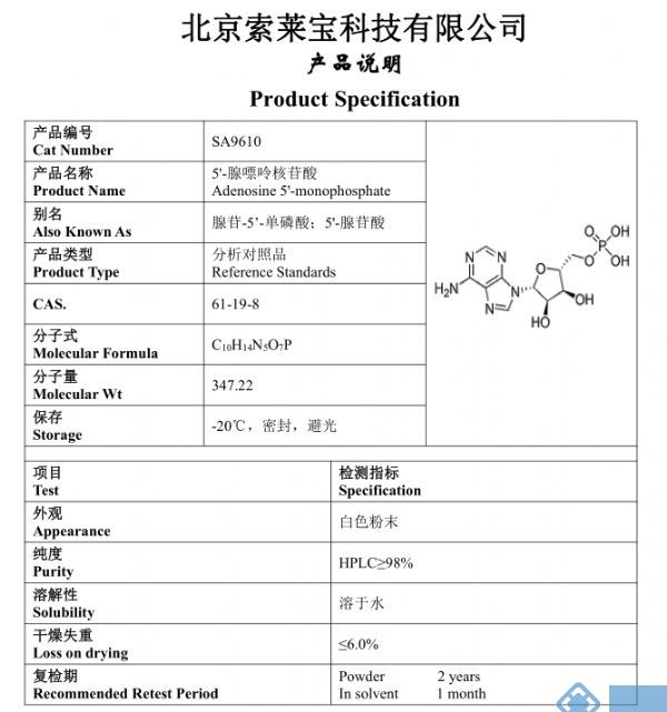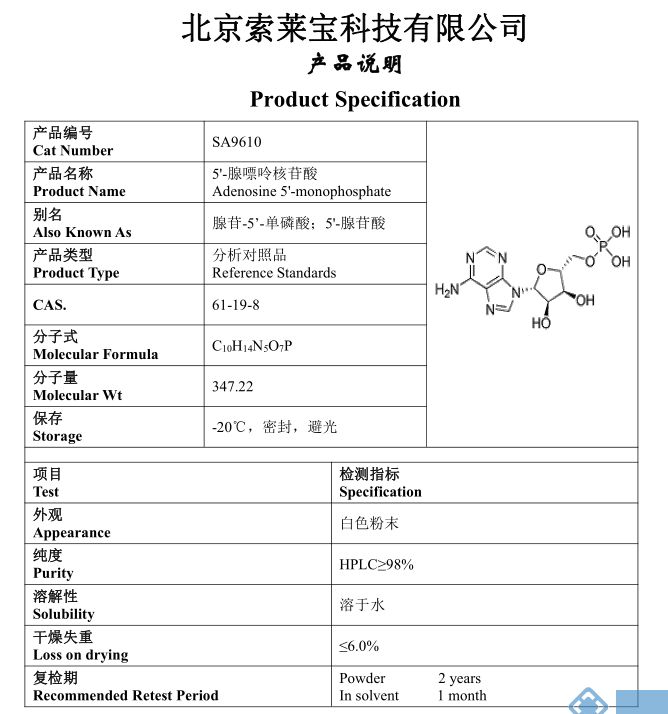 产品名称: Adenosine 5'-monophosphate/AMP;5'-腺嘌呤核苷酸